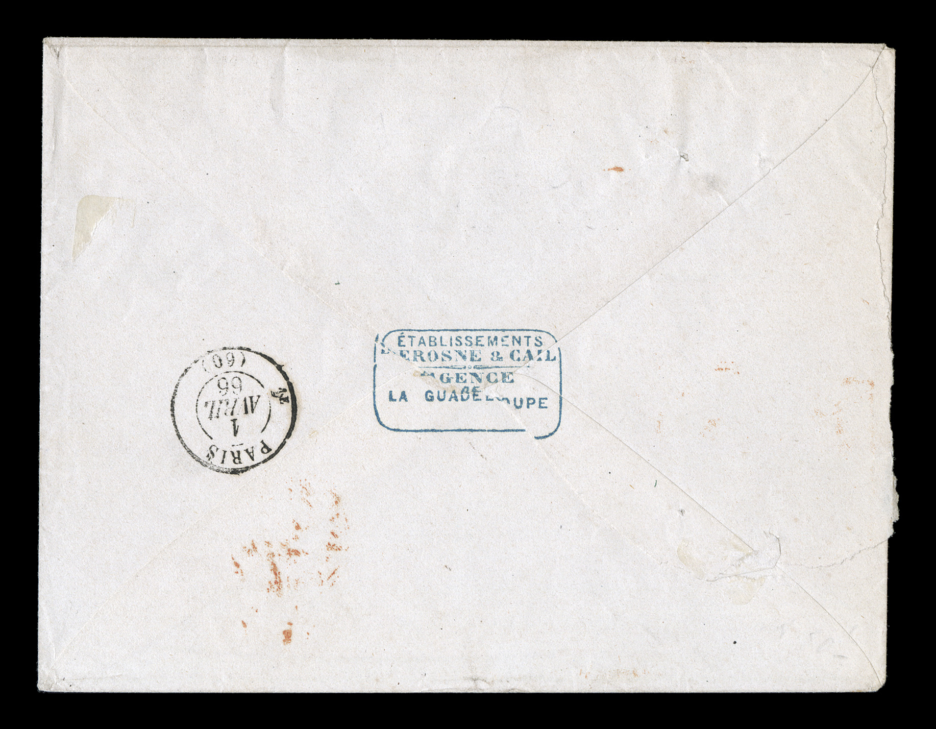 distinct GuadeloupePointe-a-Pitre8 Mars 1866 double-circle c.d.s.French Colonies Yvert #4, 6, 1865 20c Blue and 80c Rose, lovely singles with large margins and bright colors, tied to attractive 1866 cover to France by black lozenge cancels, distinct "Guadeloupe/Pointe-a-Pitre/8 Mars 1866" double-circle c.d.s. at bottom left, via French packet with red St. Nazaire entry transit, boxed red "PD" handstamp, backstamped Paris, tear to backflap, very fine featuring both an attractive franking and lovely markings; a nice double franking of the reduced 50c rate that was applied to covers carried by French packet from 1864 until 1876. (imagea) (Image) Est. $500-750