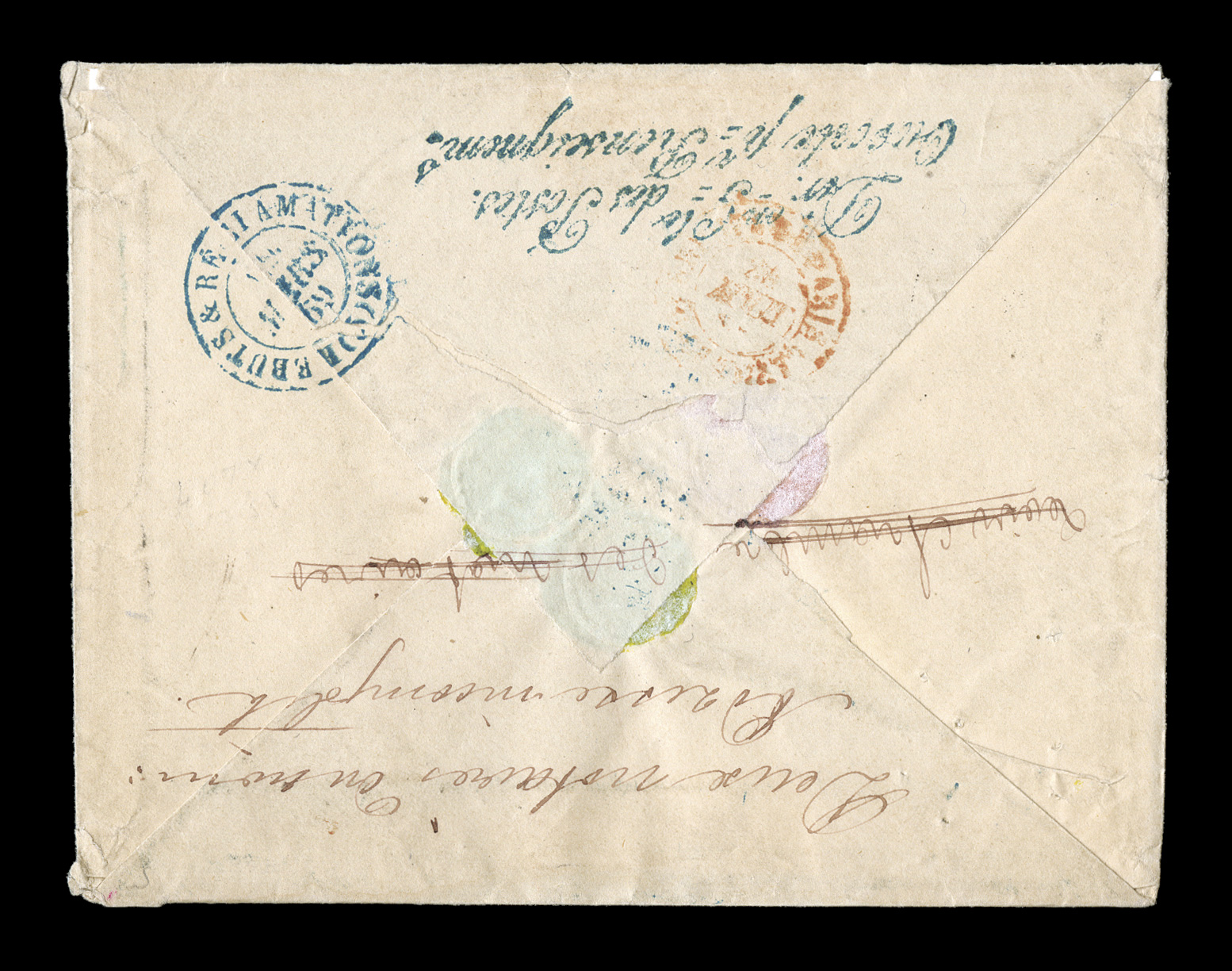 single of the 40c, large margins to just in, tied to neat 1868 covFrench Colonies Yvert #3, 4, 5, 1859-65 10c Yellow bister, 20c Blue and 40c Vermilion, attractive three-color franking with singles of the two low values and a horizontal pair and single of the 40c, large margins to just in, tied to neat 1868 cover to France by lozenge cancels, small Guadeloupe/Pointe-a-Pitre/6 Aout 1868" double-circle c.d.s., via French packet with attractive blue St. Nazaire entry transit, black boxed "PD" handstamps, backstamped Paris, very fine and colorful cover; an especially rare usage as the address was insufficient for delivery and the cover was turned over to the office of "Rebuts" office with blue "Rebuts & Reclamation/19 Mars 1869" backstamp and two line cachet "Dir. Gle. des Postes./Ouverte pr. Renseignems." handstamp; exceptionally rare on any colonial cover and only two covers from Guadeloupe recorded with these markings. (imagea) (Image) Est. $1,500-2,000