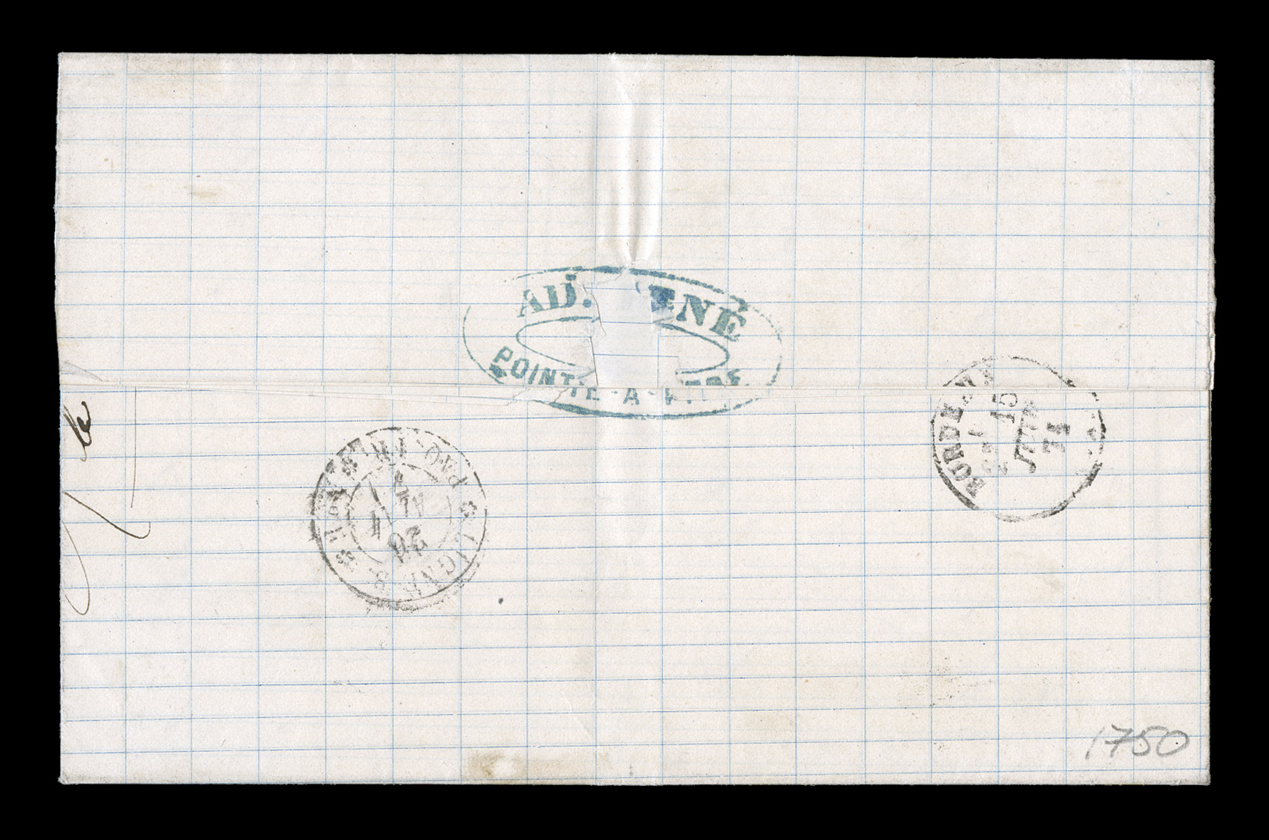 folded letter to France by black lozenge cancel, with light striFrench Colonies Yvert #6, 1865 80c Rose, a spectacular single with large to huge margins showing a portion of the next stamp at bottom, in single franking tied to an 1870 entire folded letter to France by black lozenge cancel, with light strike of scarce "Paq. Ang./Pointe-a-Pitre Guade/25 Dec 70" double-circle sorting c.d.s. specifying that this should go by British packet, red boxed "PD" handstamp, black Calais entry transit, backstamped Bordeaux, extremely fine; this single franking is of the greatest rarity as there was no 80c rate in the pre-U.P.U period when the Eagle stamps were being used; the cover offered here pays the 70c single British packet rate and is 10c overpaid; an especially rare cover in this remarkably choice quality. (imagea) (Image) Est. $400-500