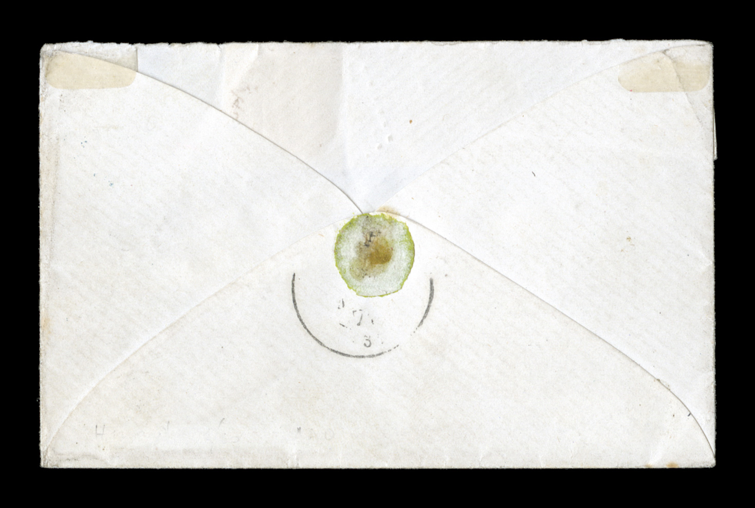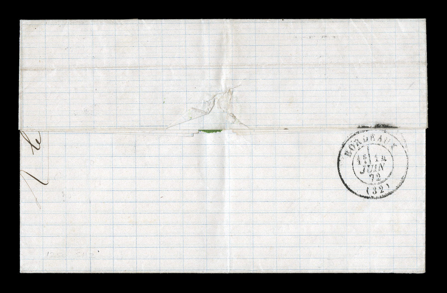 cover for Affaires Ecclesiastiquies. and wrapped around to the reverFrench Colonies Yvert #2, 1862 5c Green irregular block of fourteen, with margins nearly all around, because of its size the block was affixed at the left of an 1866 imprinted cover for "Affaires Ecclesiastiquies." and wrapped around to the reverse, tied by bold black lozenge cancels, matching "Guadeloupe/Basse Terre/26 Mai 66" double-circle c.d.s. at right, red boxed "PD" handstamp, carried by British packet to France with this unusual franking paying the 70c single British packet rate, red packet entry transit, arms cachet on the reverse and backstamped Sauveterre d' Aveyron, stamps creased where wrapped around and cover opened out on three sides for display, otherwise very fine and impressive; an exceptionally rare Eagle franking with only the 5c value, this being the largest recorded multiple of the Five Centimes Eagle on cover; signed R. Calves. (imagea) (imageb) (Image) Est. $2,000-3,000