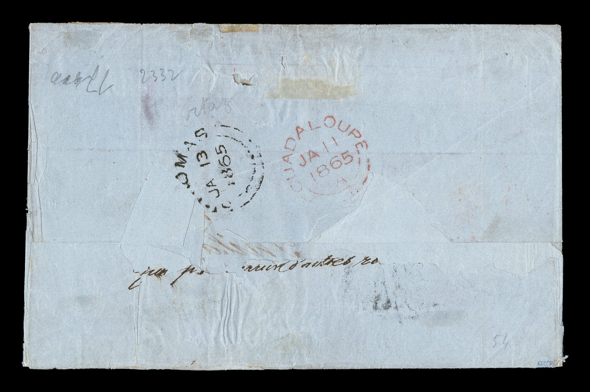 of a 10c vertical pair and 40c horizontal pair and strips of four andFrench Colonies Yvert #3, 5, 1859 10c Yellow bister and 40c Vermilion, a truly amazing Eagle franking on a quadruple-rate 1865 cover to the United States, the franking consists of a 10c vertical pair and 40c horizontal pair and strips of four and six, margins range from fairly sizable sheet margins to one stamp of the strip of six being strongly torn in at top, all tied by black lozenge cancels with a black "Pointe-a-Pitre/Guadeloupe/10 Janv 1865" rimless c.d.s. tying the strip of four, clear and attractive strike of the rare "Paid/at/Guadaloupe" Crowned-circle handstamp of the British Agency, "4/-" British rate marking in red crayon, plus red British "Guadaloupe/JA 11 1865" double-arc c.d.s. and similar black St. Thomas transit on the reverse, posted to Philadelphia with two "Boston/30/Feb 2" accounting c.d.s. also tying the strip of six, edge wear and wrinkles to the cover affecting some of the stamps, still a fine appearing and impressive paid cover through the British Agency; a cover of the greatest rarity being the only recorded quadruple-rate cover to the United States. (imagea) (Image) Est. $3,000-4,000