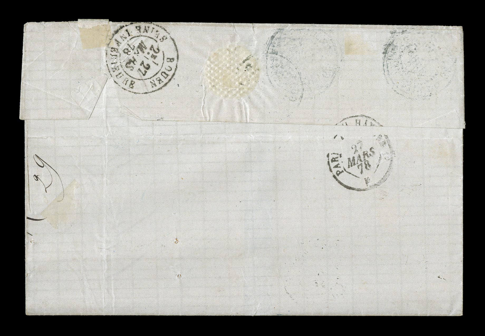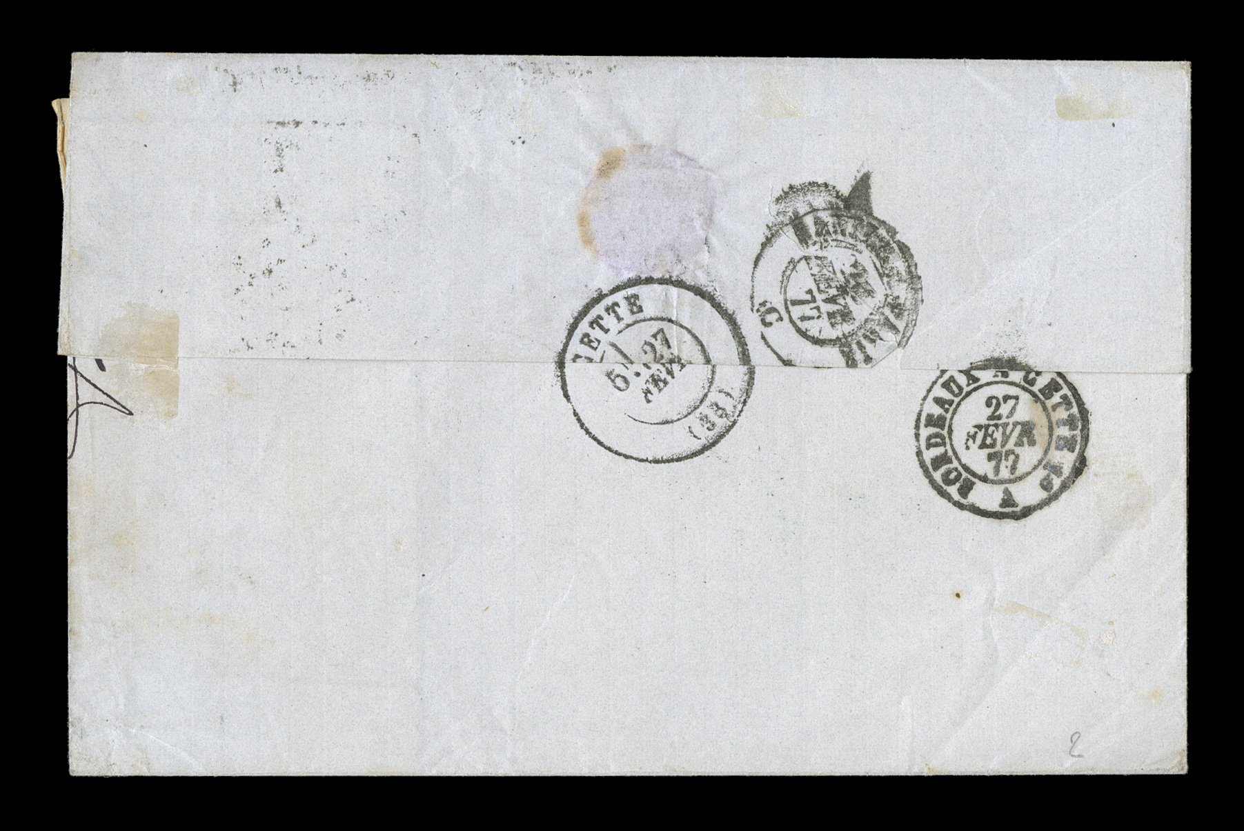 B red entry transit, T in triangle and 7 due handstamps fo1878 Pointe-a-Pitre unpaid entire letter to France with black "Paq. Fr./Pointe-a-Pitre Guade./27 Janv. 78" double-circle sorting c.d.s., carried by French packet with octagonal Line "B" red entry transit, "T" in triangle and "7" due handstamps for 7 decimes to be collected, slight soiling along file fold, very fine and choice; this cover illustrates the ability to send letters to France unpaid during the U.P.U. period and the normal practice would be to charge double the prepaid amount which makes this cover quite unusual as this was during the 40c U.P.U. rate period needing 8 decimes to be double, the 35c period not starting until May 15, 1878. (imagea) (Image) Est. $200-300