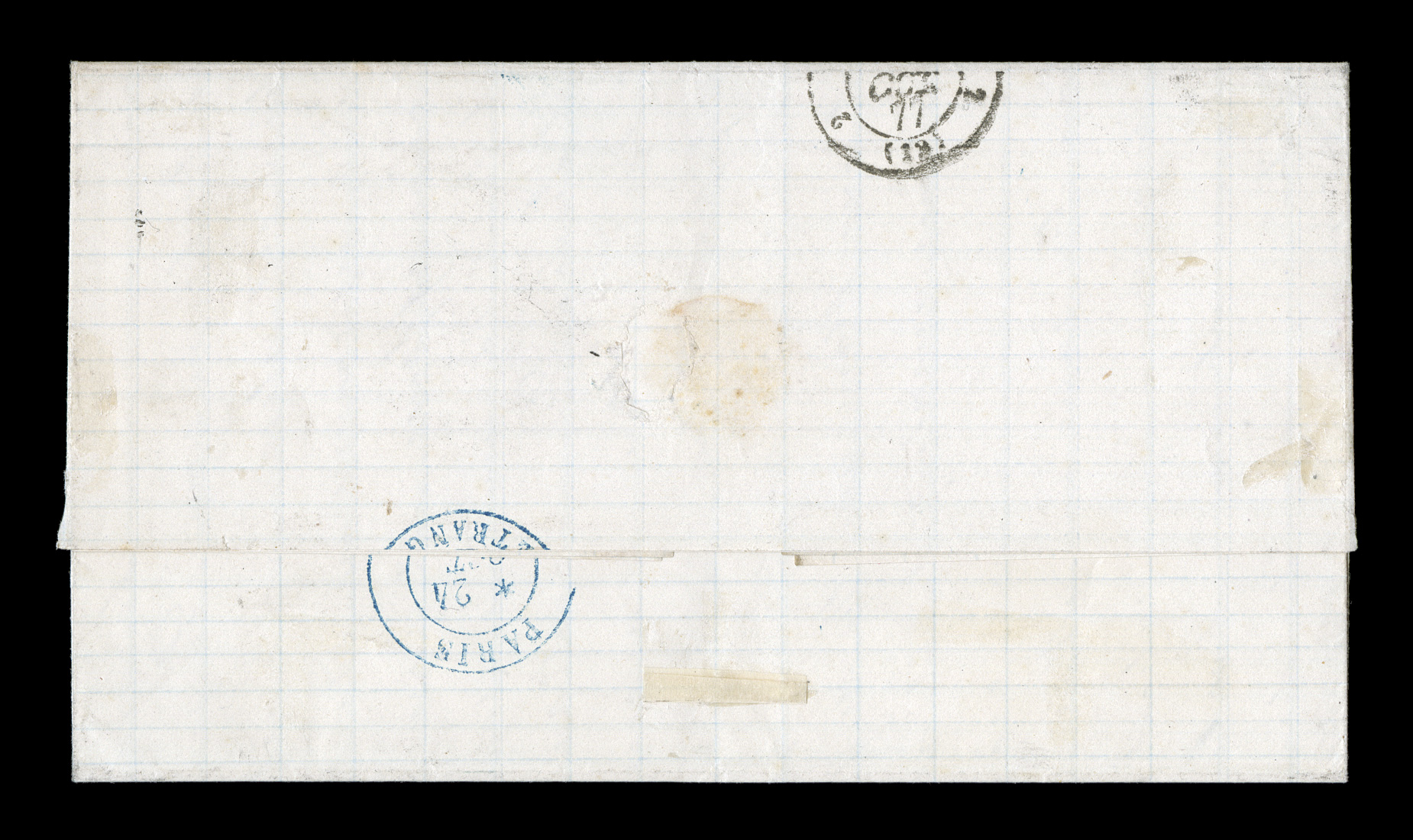 cover to the United States by rare blue lozenge cancel, turned over toFrench Colonies Yvert #4, 5, 1859-65 20c Blue and 40c Vermilion, both attractive singles with mostly large margins being slightly cut in on one side, tied to nice 1868 folded cover to the United States by rare blue lozenge cancel, turned over to the British Agency without a Guadeloupe post office postmark and receiving the incredibly rare blue "Paid/at/Guadaloupe" Crowned-circle handstamp of the British Agency, similar blue British "Guadaloupe/MR 12 1868" double-arc c.d.s. and small black St. Thomas c.d.s. transit on the reverse, "4" pence British rate marking in red crayon, and black "N.Y.Steamship/10/Mar 23" c.d.s. entry handstamp on arrival in the United States for 10c ship fee, very fine and attractive cover.The Crowned-circle paid handstamps from the various British Agency post offices around the world have always been highly collected. Guadeloupe is a particually desirable country because such covers are found with French General Colony stamps. But in addition the Crowned-circle handstamps are on very rare occasions found in blue from Guadeloupe. Usually these markings were in red and occasionally in black. Our research indicates that there are hardly any other British Agency post offices from the many around the world that used blue ink, Guadeloupe being one of only two or three agencies where it is found, and even in Guadeloupe it is of the utmost rarity. The well struck example offered here is believed to be one of only two examples recorded; a marvelous Guadeloupe rarity of the British Agency; ex-Levett. (imagea) (Image) Est. $5,000-7,500
