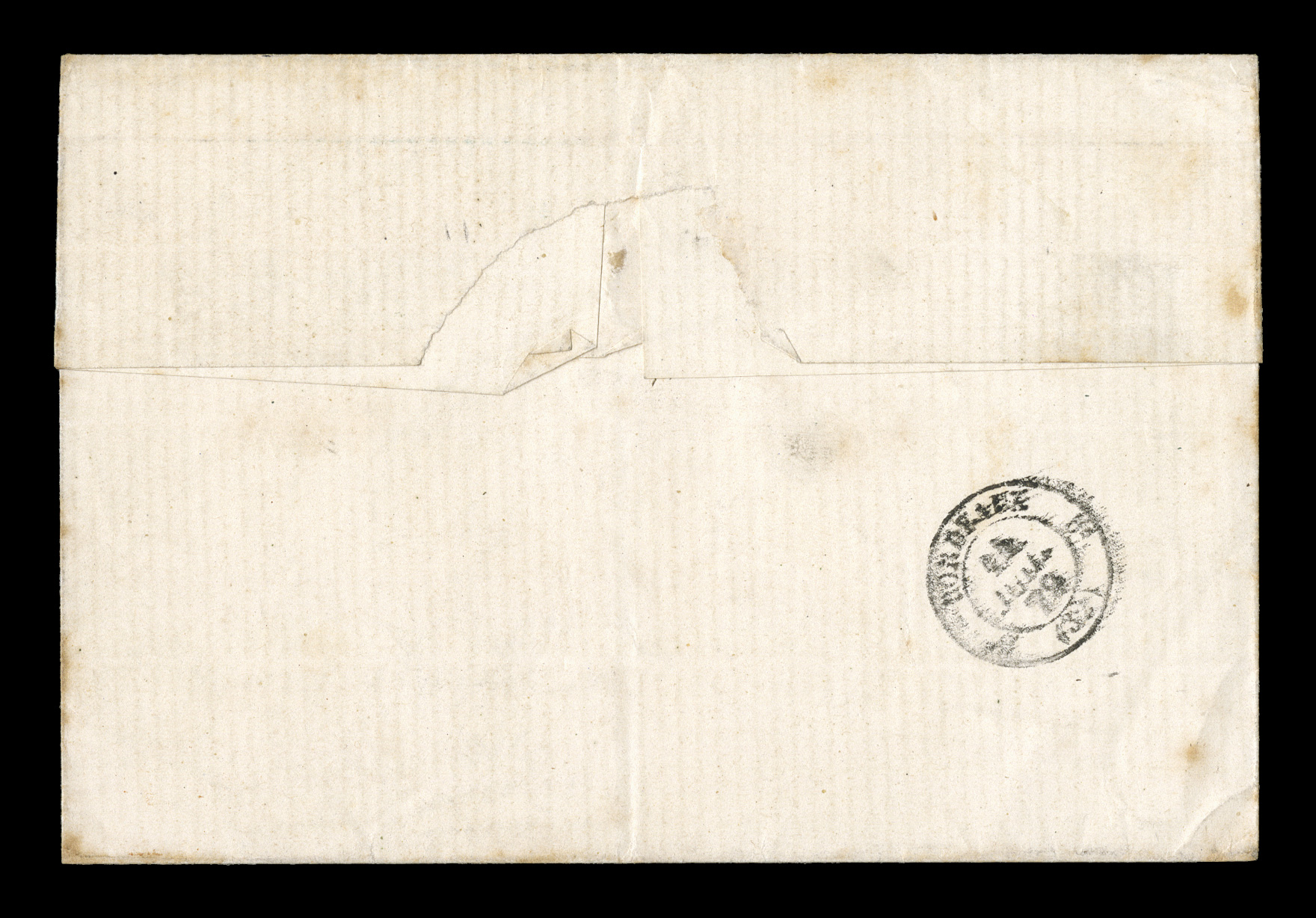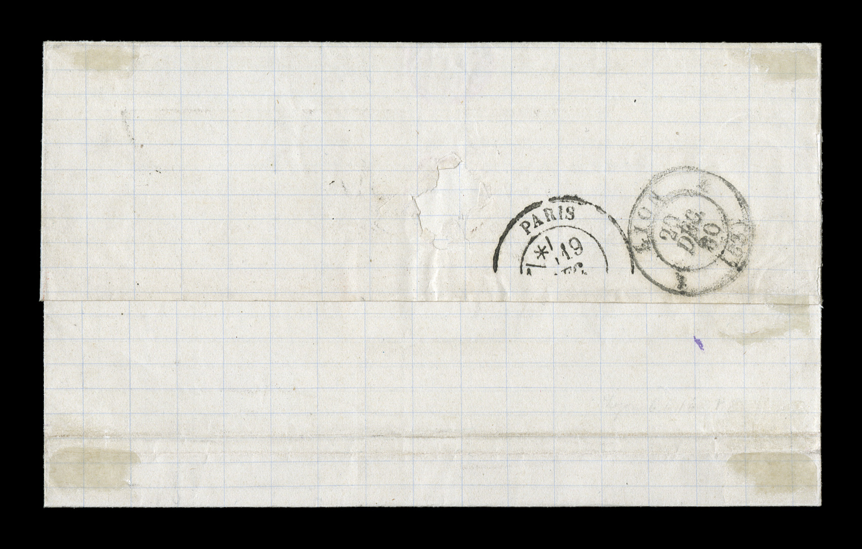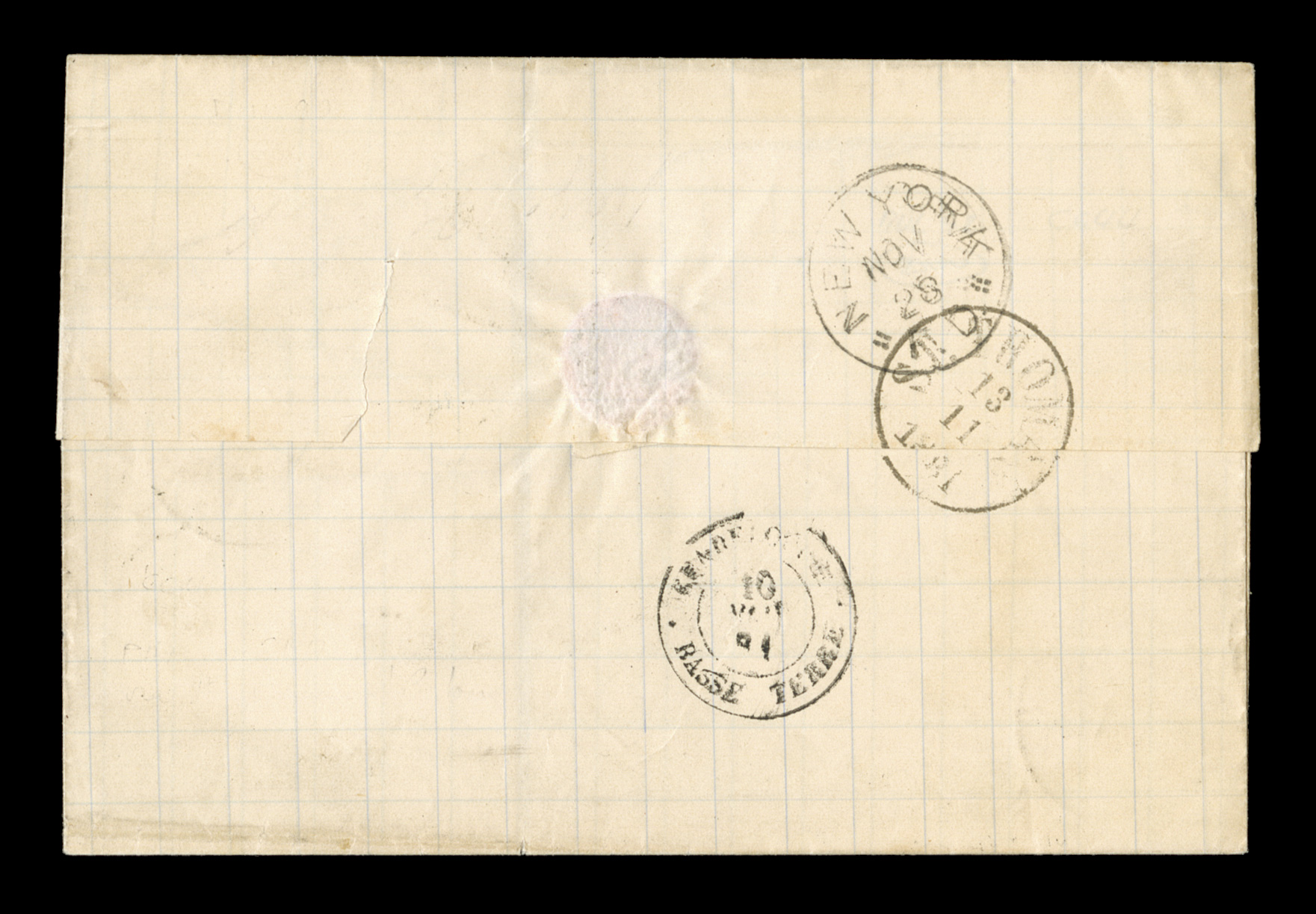letter to France by black GuadeloupeBasse Terre20 Nov. 81 double-ciFrench Colonies Yvert #44, 1880 25c Bister Yellow, Ty. II, premium single with extraordinarily large margins all around paying the 25c U.P.U. rate, tied to 1881 entire folded letter to France by black "Guadeloupe/Basse Terre/20 Nov. 81" double-circle c.d.s. with additional strike at left, backstamped Bordeaux, very fine; signed H. Bloch. (imagea) (Image) Est. $150-200