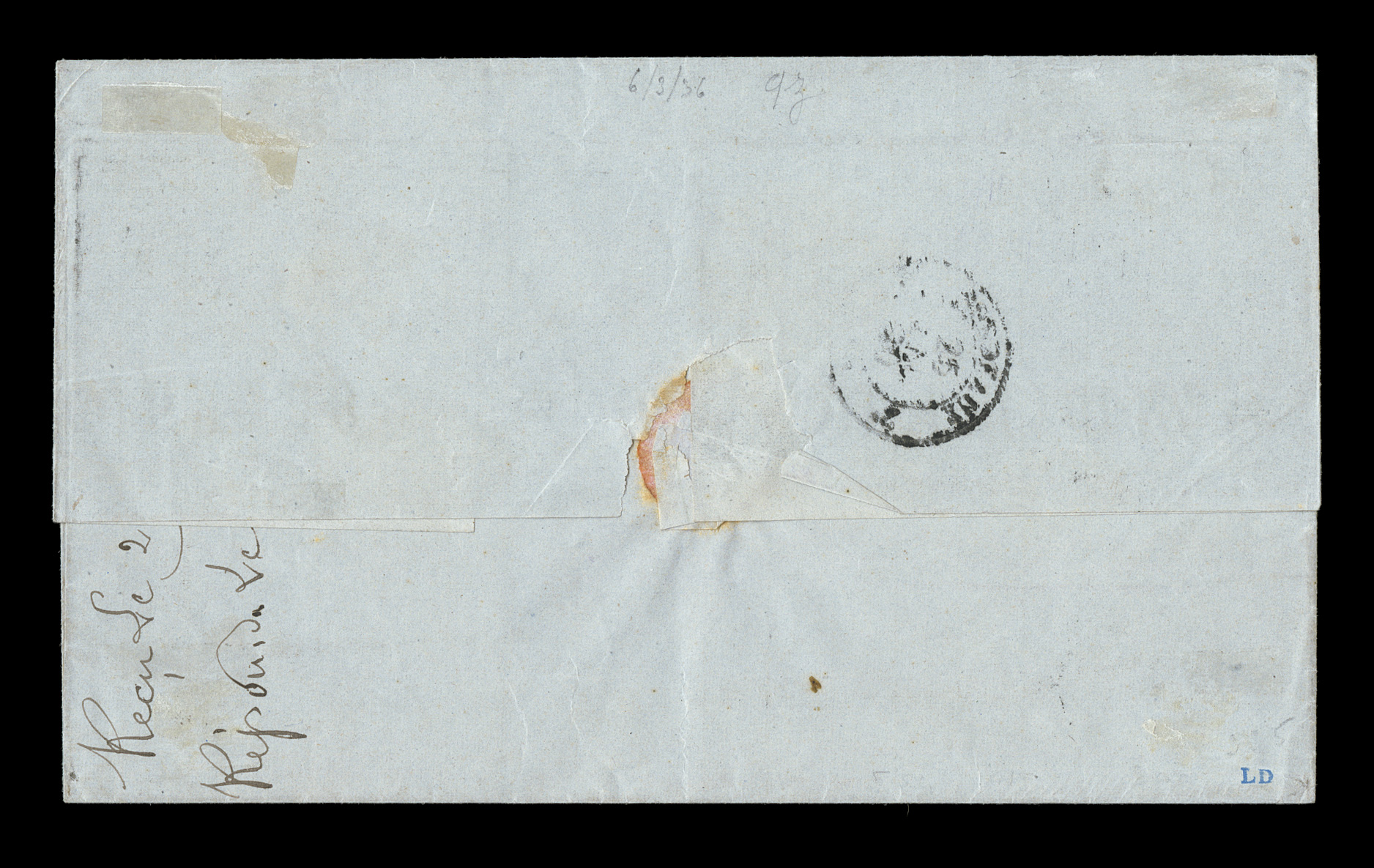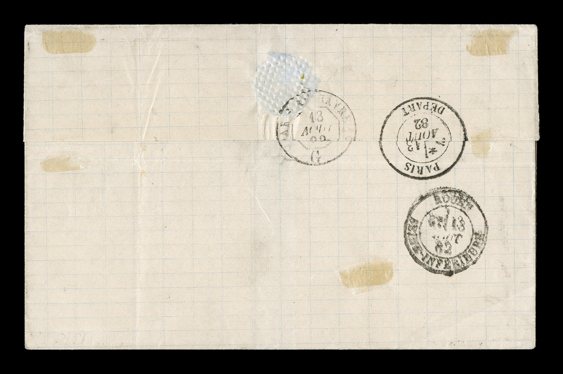Guade10 Mai 79 double-circle sorting c.d.s. with an additional strikeFrench Colonies Yvert #23a, 1872 25c Blue, Ty. III, choice single with large even margins all around, tied to 1879 entire folded letter to France by "Paq. Fr./Pointe-a-Pitre Guade/10 Mai 79" double-circle sorting c.d.s. with an additional strike at right, carried by French packet with red octagonal packet transit of Line "A", backstamped Bordeaux, fresh and attractive, choice very fine; an early example of the 25c U.P.U. rate by French packet that went into effect on February 16, 1879 and thereafter. (imagea) (Image) Est. $150-200