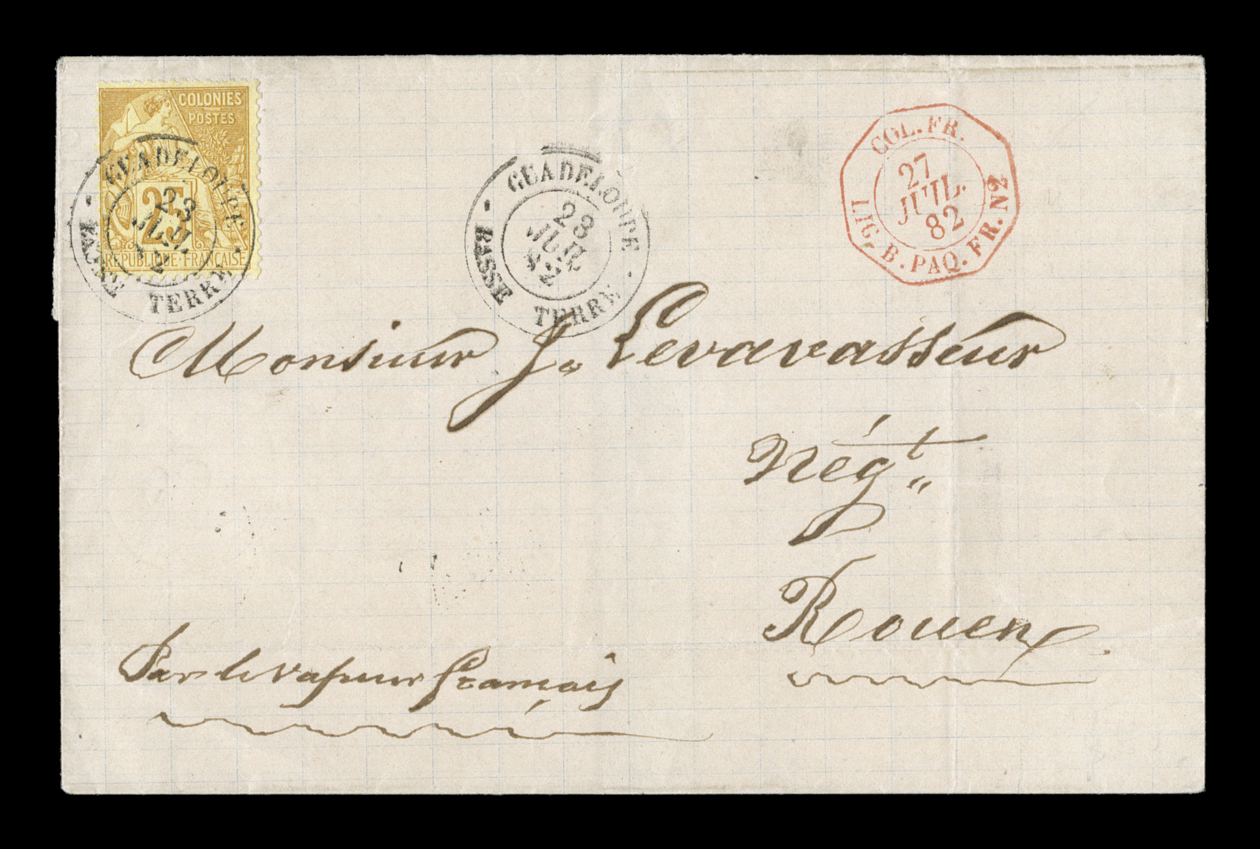 GuadeloupeBasse Terre9 Aout 81 double-circle c.d.s. with additional sFrench Colonies Yvert #44, 1880 25c Bister Yellow, Ty. II, well margined and bright single franking paying the 25c U.P.U. rate, tied to 1881 folded cover to France by black "Guadeloupe/Basse Terre/9 Aout 81" double-circle c.d.s. with additional strike at right, carried by French packet with black Line "A" octagonal entry transit, Paris transit, backstamped Roen, very fine. (imagea) (Image) Est. $150-200
