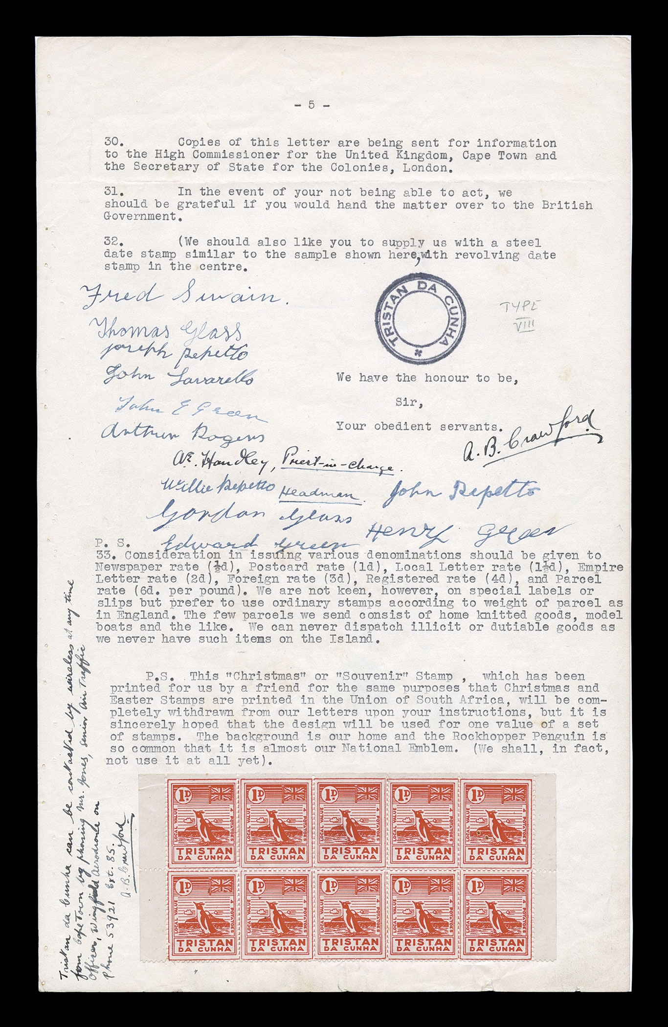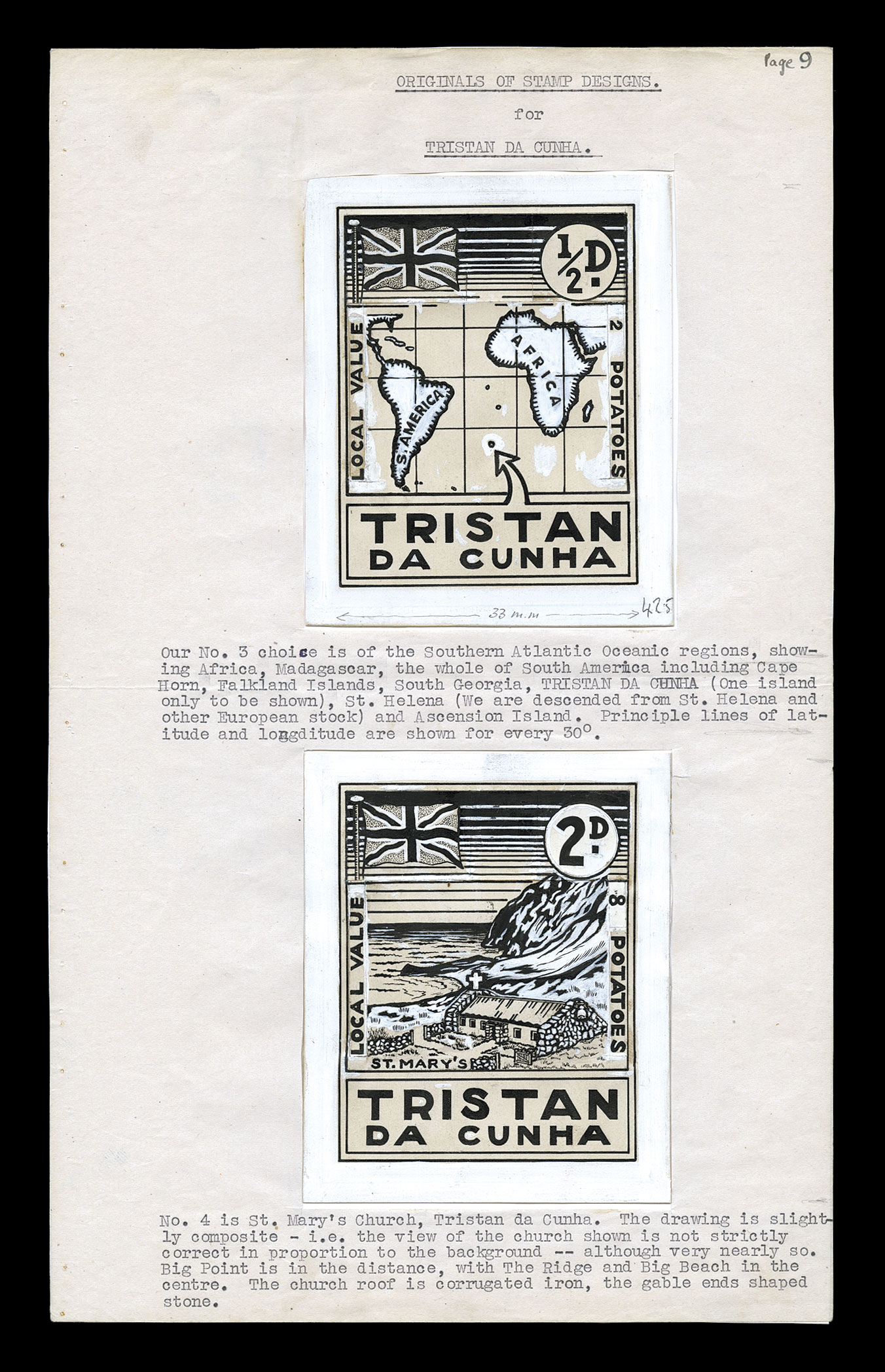 request and on page 6 is a card with the proposed design of nine valu1946 Petition for Postage Stamps and proposed essays, sixteen page typed petition submitted to the Postmaster General of South Africa in Capetown, outlining the reasons for the request and on page 6 is a card with the proposed design of nine values, as well as nine large size hand drawn essays (approximately 94x117mm), the tenth large essay (2d King George VI) has fallen off the pages and is replace by a photocopy, page five contains of block of ten of the 1p "Potato" label, as well as a Ty. VIII cachet and signatures of the island council, what were pages 15 and 16 (photographs) have been remounted on a single page and, for conservation reasons, the staples that bound the petition together have been removed and each page has been neatly and lightly mounted on archival board, fine; this is the finest of only three such petitions in private hands, being the most complete of the three; an indispensable item for a serious Tristan da Cunha collection and would make an outstanding frontispiece for exhibition; ex-Peck. (imagea) (imageb) (imagec) (Image) Est. $15,000-20,000