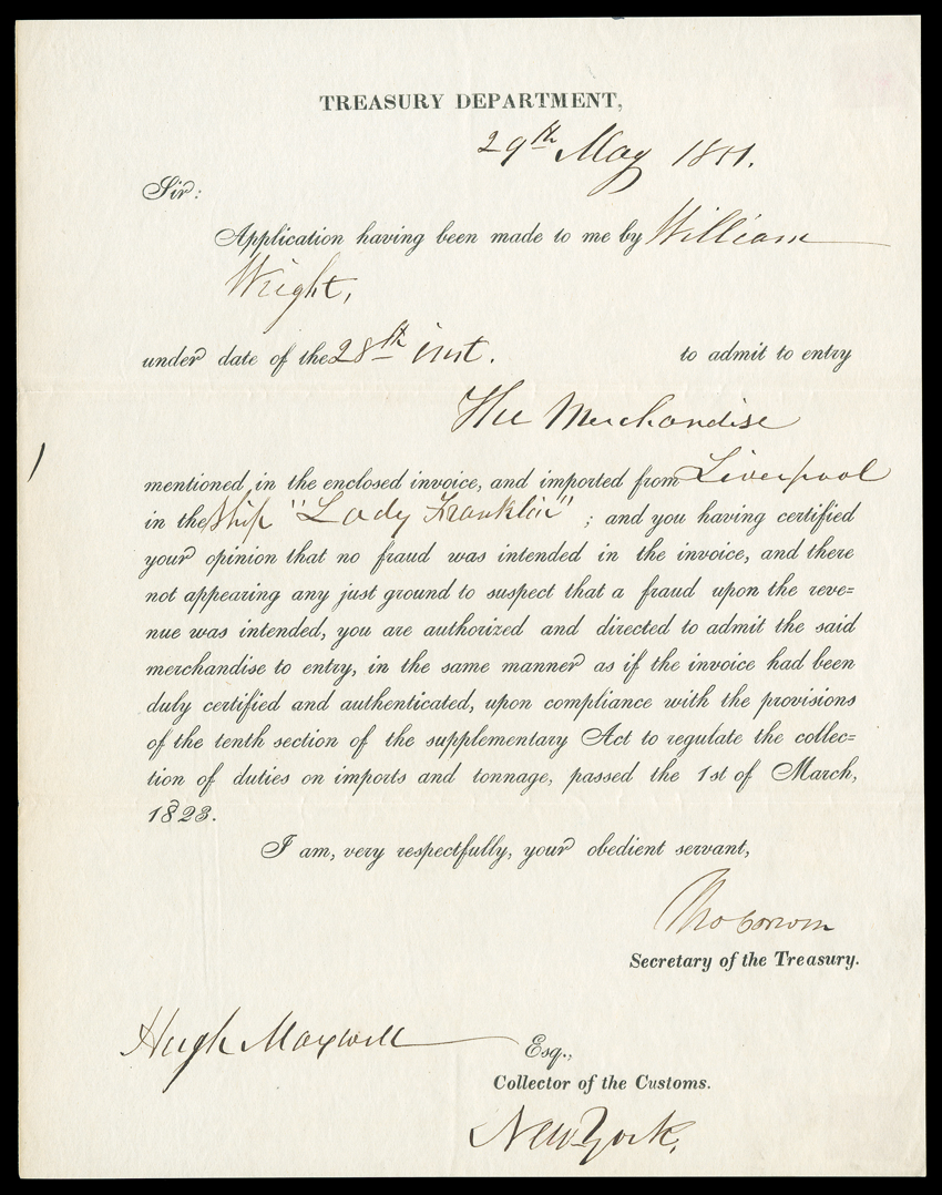 [Washington], December 22, 1841. Forward approves the claim of John RSecretaries of the Treasury, 1841-53 [Tyler - Fillmore] Excellent group of autographs including partly printed Document Signed "W. Forward" as Secretary, 2/3 page, 4to, [Washington], December 22, 1841. Forward approves the claim of John Reid Jr. in the amount of $35.40, and approves Commissioners Ed Curty, Thomas Lord, and O. Hoffmann to disburse it. Fold wear, VG. With DS "J.C. Spencer," as Commissioner of the Canal Fund, 1 page, oblong 8vo, Albany, NY, October 1, 1841. A pay order to cashier A.D. Patchin on the Bank of Buffalo in the amount of $1136.32. Transferred to L.F. Tiffany on verso. Mounting traces on verso, pin holes at right, overall VG. With LS "J.C. Spencer" as Secretary, 1/3 page, 4to, Washington, May 11, 1843. He informs Aaron O Dayton, Fourth Auditor of the Treasury, that W. Snethen is applying for post of chief clerk in his office. He adds in an Autograph Postscript Signed "J.C.S" that "I have reason to suppose he has written to the President" [John Tyler], adding that "There are reasons why it is better my name should not be quoted in this matter." VG. With ALS "Geo. M. Bibb" as Secretary, 1/3 page, 4to, Washington, September 25, 1844. He writes Collector of the Port of Baltimore N.F. Williams that "From information received since the appointment of Mr. Culley as inspector, it seems proper that he be removed & that the person in whose place he was appointed, be reinstated." VG/F. With ALS R.J. Walker" as Secretary, 1/2 page, 4to, no place, July 12, 1845. He writes C.W. Laurence of New York, "Desirous of making the office of Secret Inspector really useful Judge May was appointed at my suggestion...It is almost indispensable, to enable him to do much good, that his appointment shall remain unknown, & his accounts as they now are separated from the public accounts..." Paste stains at edge, otherwise about G/VG. With ALS "Thos. Corwin" as US Representative from Ohio, 3/4 page, 8vo, Washington, April 27, 1860. He sends Mrs. S.I. Larned of the same city a speech that he says "should not be called a speech, but a talk, for it was altogether unpremeditated." Mounting strip on verso, otherwise VG. With one manuscript and one partly printed LS as Secretary, each 1 page, 4to, Washington, January 22 and May 29, 1851. The first explains to Thomas Dudley of Buffalo that the collectorship for Sacramento has been filled; the second authorizes the merchandise on the Liverpool ship Lady Franklin to sold as per the enclosed invoice (not present), which does not show evidence of fraud. Both VG. Also with an Autograph Envelope Franked "Th. Corwin" in upper right corner, addressed to John A. Blackwell of Washington. Paste stains, otherwise VG. (imagea) (imageb) (Image) Est. $500-750