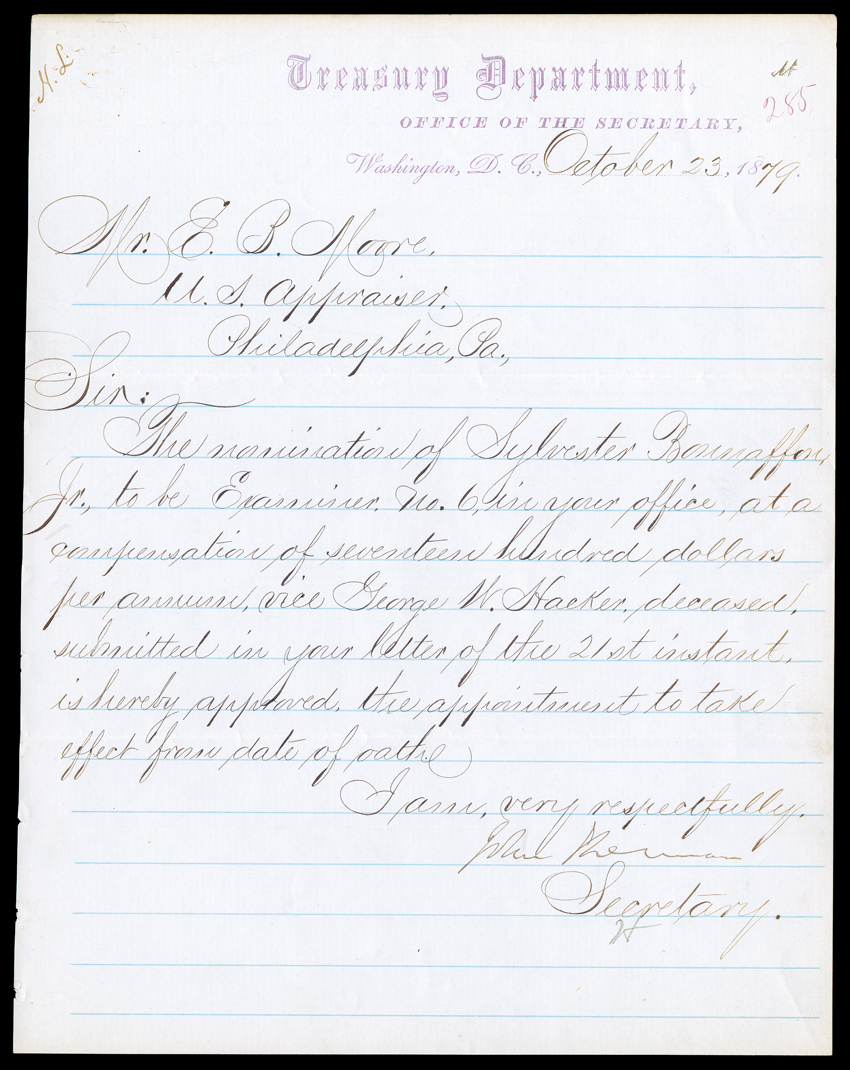 sponsoring the Sherman Antitrust Act brother of Gen. William T. ShermSherman, John American politician (1823-1900); US Secretary of State under McKinley and US Secretary of the Treasury under Hayes; earlier, an influential US Senator from Ohio, sponsoring the Sherman Antitrust Act; brother of Gen. William T. Sherman. A good pair of Manuscript Letters Signed "John Sherman" as Secretary of the Treasury, each 1 page, 4to, on imprinted Treasury Department stationery, August 8 and October 23, 1879. Both are to US Appraiser E.B. Moore of Philadelphia, the first acknowledging receipt of "Your application for the permanent continuance in service of John Odell and Matthew Muir, as packers at $900 per annum, and John Ryan and George C. Freeman, laborers at $700" and will refer the matter to Assistant Secretary John B. Hawley; Moore may keep them on 10 days beyond their current term while the matter is pending. Light toning and wear at top edge, otherwise VG. Hawley would leave office the following March to run for governor of Illinois and to support U.S. Grant in a possible bid for a third (nonconsecutive) term. Since Sherman was also a candidate, rumors arose that he had ousted his assistant. Sherman had hoped to win nomination as a compromise between Grant and James G. Blaine, but it went to a dark horse--Sherman's own campaign manager, James A. Garfield. The second letter informs Moore that "The nomination of Sylvester Bonnafon, Jr., to be Examiner no. 6, in your office, at a compensation of seventeen hundred dollars per annum, vice George W. Hacker, deceased...is hereby approved..." Some edge wear and light toning, otherwise VG. Seventeen hundred 1879 dollars is an income equivalent to about $36,000 today. (imagea) (Image) Est. $500-750