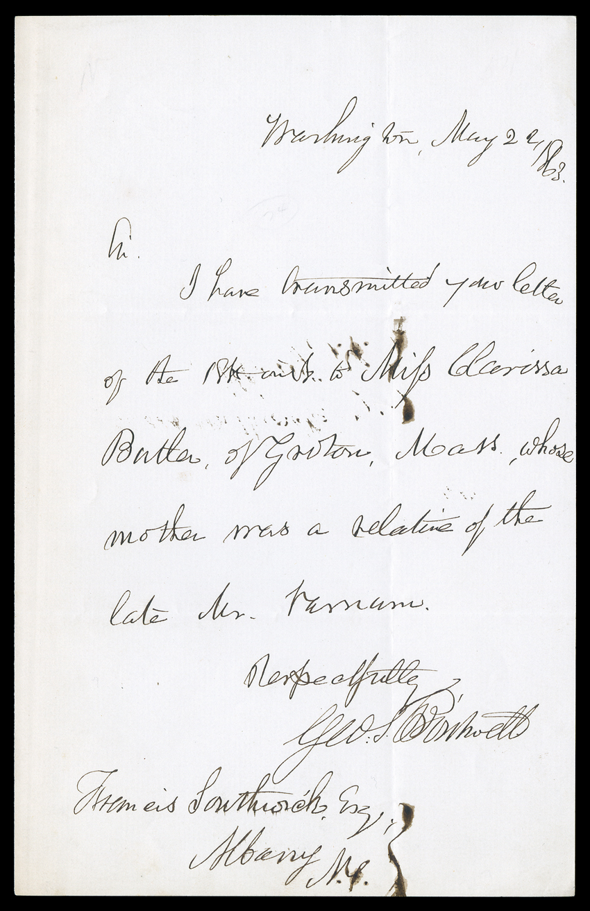 as US Representative from MA, 1 page, 8vo, Washington, May 2Secretaries of the Treasury, 1869-77 [Grant-Hayes] Autographs from the administrations of U.S. Grant and Rutherford B. Hayes. Includes Autograph Letter Signed "Geo: S. Boutwell" as US Representative from MA, 1 page, 8vo, Washington, May 22, 1863. He tells Francis Southwick of Albany, NY that he has forwarded his letter "to Miss Clarissa Butler of Groton, Mass., whose mother was a relative of the late Mr. Varnam." Blotting and consequent offsetting from addressee line, otherwise VG. With LS "Geo: S. Boutwell" as Secretary, 1-1/5 pages, 4to, on imprinted official stationery, Washington, November 15, 1870. He writes to Major John Coon of the Society of the Army of the Cumberland that he cannot attend their fourth annual reunion, but that "General [George H.] Thomas was a pure patriot and an able soldier, and I join heartily in the honors which your Society bestows upon his name and memory." Toned, with some wear at left edge, paper clip marks, overall VG. General Thomas, "The Rock of Chickamauga," has come to be considered one of the top Union generals, though at the time he was criticized for his deliberation and care when preparing for battle. Grant had nearly removed him from command before the Battle of Nashville for refusing to attack, but Thomas had simply been waiting for an ice storm to end. Nashville became the most lopsided Union victory, effectively ending the war in the west. General Thomas had just died in March 1870. With ALS "Geo: S. Boutwell," 1 page, 4to, Groton, December 2, 1903. In a very shaky hand, the elderly Boutwell writes Charles Bistwell of Boston to assure him that "you may count with reasonable certainty upon my presence at the Festival of the Unitarian Club at the Vendome..." Fold wear, otherwise G/VG. The Vendome Hotel in Boston would be the site of a tragic fire in 1972 that took the lives of nine firefighters. With DS "Wm. A. Richardson" as Secretary, 1 page, legal folio, Washington, September 29, 1873, authorizing Assistant Secretary John F. Hartley to "sign warrants for the payment of money into the public treasury, and all warrants for the disbursement from the public treasury." With embossed Treasury Seal. Some smudges, else VG. With LS "B.H. Bristow" as Secretary, 2/3 page, 4to, on Treasury Department stationery, Washington September 21, 1874. He writes Attorney General George H. Williams, transmitting copies of papers relating to "John S. Pray and others, owners of Ships 'Prima Donna,' 'Semiramis,' and 'Yosemite'..." (not present). VG. With LS "L.M. Morrill" as Secretary, 1 page, 8vo, on official stationery, Washington, December 9, 1876. To Ben Perley Poore of the same city, he sends a correction to the Congressional Directory: "My residence at present is Wormley's. My wife and two daughters are with me." Finally, with a 16mo Card Signed "John Sherman / Secy Treasy.". Fine. (imagea) (imageb) (Image) Est. $500-750